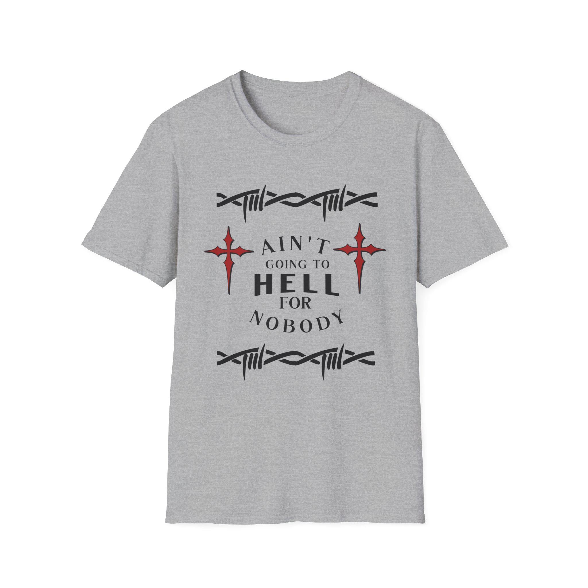 Unleash your individuality with this striking unisex t-shirt, perfect for those who celebrate life in all its forms. Made from ultra-soft, lightweight fabric, this tee ensures comfort while making a bold statement. The eye-catching design featuring the phrase "AIN'T GOING TO HELL FOR NOBODY" adds a touch of flair to any casual outfit, making it ideal for everyday wear, gatherings, or relaxed outings with friends. It's perfect for anyone who appreciates a blend of style and personality, resonating especially with those who love unique expressions of faith and freedom.